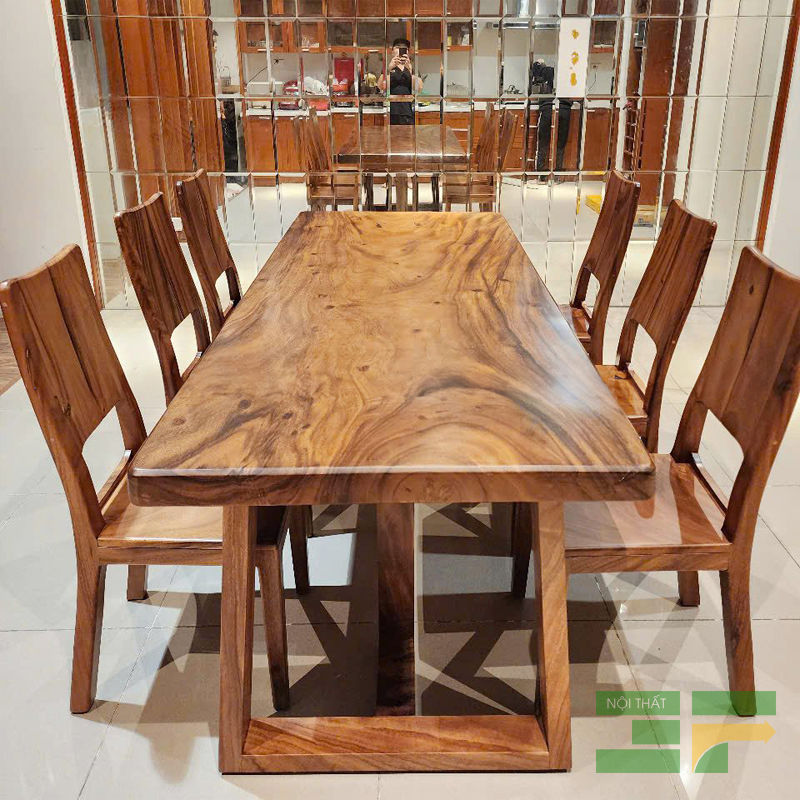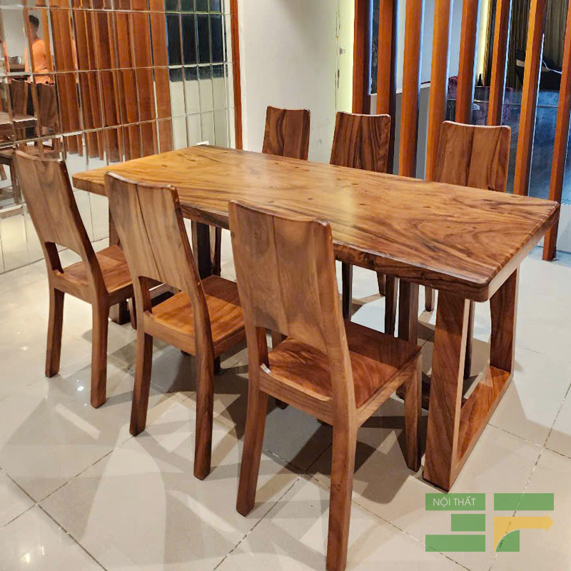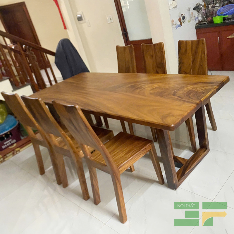 Mặt bàn me tây nguyên tấm dày dặn: Tâm điểm của bộ bàn ăn là mặt bàn được chế tác từ những phiến gỗ me tây nguyên tấm chọn lọc, có độ dày ấn tượng, phô diễn trọn vẹn vẻ đẹp của những đường vân gỗ tự nhiên, cuộn xoáy đầy mê hoặc. Bề mặt bàn được xử lý tỉ mỉ, phủ lớp sơn cao cấp, vừa bảo vệ gỗ, vừa làm nổi bật màu sắc ấm áp và sự sang trọng vốn có. Kích thước bàn rộng rãi, thoải mái cho 6 người dùng bữa.